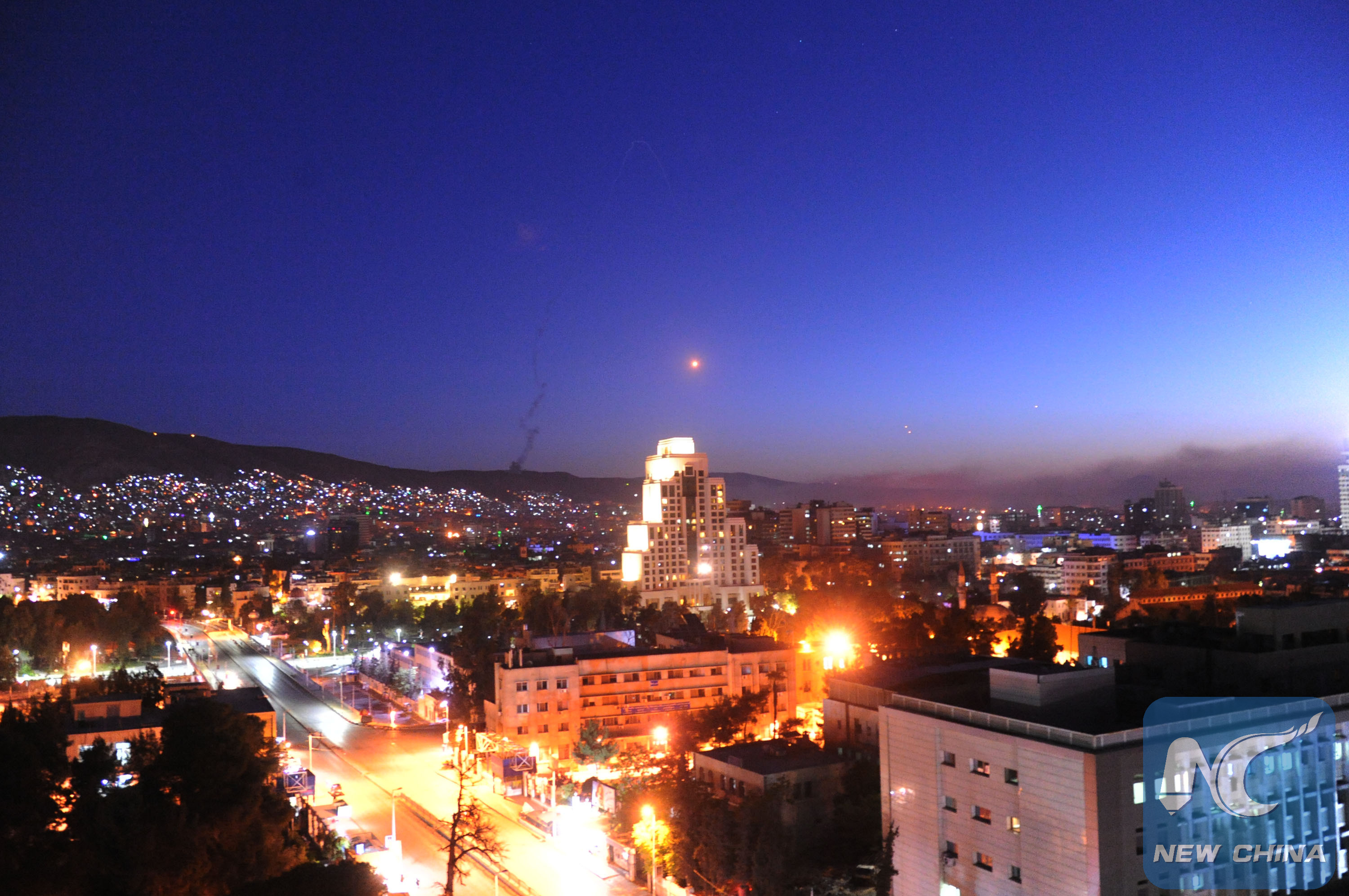 Surface-to-air missiles are seen over Syria's capital Damascus on April 14, 2018, as the Syrian air defenses were responding to U.S. attacks. (Xinhua/Ammar Safarjalani)