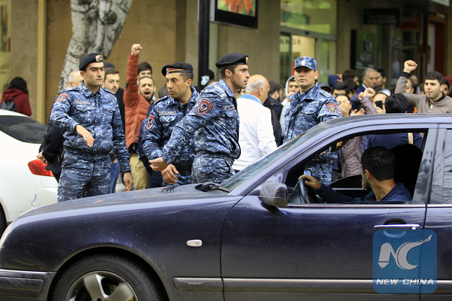 Protestors gather on the Republic Square during a rally against the newly-elected Prime Minister Serzh Sargsyan in downtown Yerevan, Armenia, on April 22, 2018. (Xinhua/Gevorg Ghazaryan)