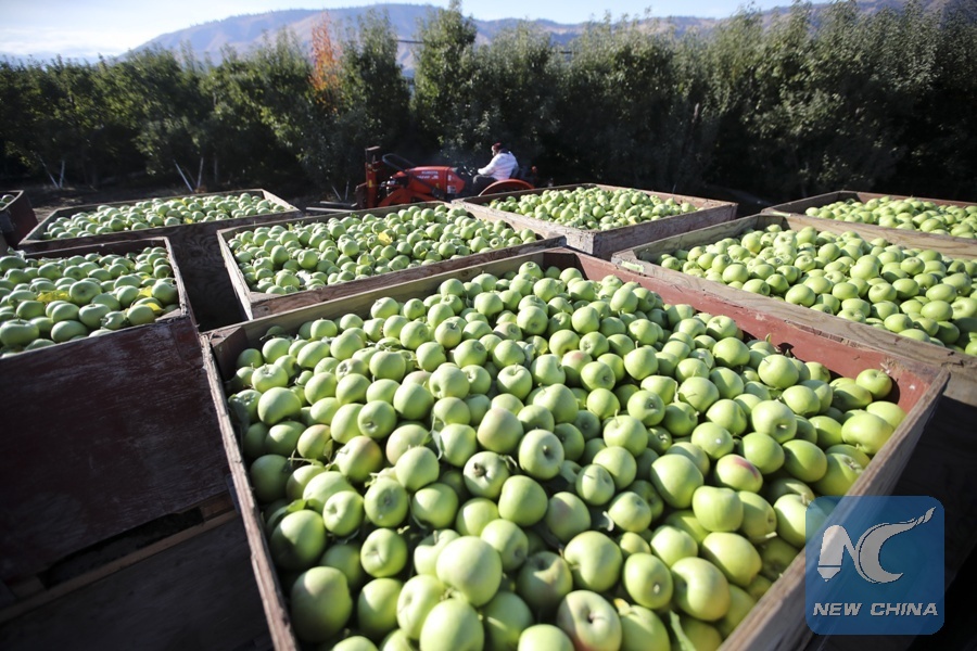 File Photo: Containers full of granny smith apples are seen in an apple orchard of Auvil Fruit Company in Wenatchee, Washington State, the United States, on Nov. 3, 2017. (Xinhua/Wang Ying)