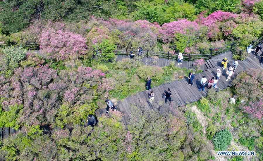 Aerial photo taken on April 28, 2018 shows tourists enjoying blooming azalea flowers on the Guifeng Mountain in Macheng City, central China's Hubei Province. (Xinhua/Cheng Min)