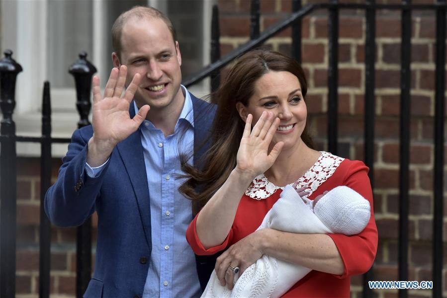 Prince William (L), Duke of Cambridge, and his wife Catherine, Duchess of Cambridge, present their newborn son outside St. Mary's Hospital in London, Britain, on April 23, 2018. Catherine on Monday gave birth to a boy, her third child, who is the fifth in line to the British throne. (Xinhua/Stephen Chung)