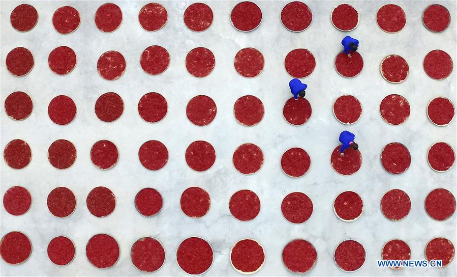 Aerial photo taken on April 25, 2018 shows Zou Daying together with employees drying chillies in her factory in Shangfu Town of Fengxin County, east China's Jiangxi Province. Born in a remote village in Jiangxi Province in 1953, Zou Daying once worked in a community before retirement in 2013. During the time, she always shared her self-made chilli sauce with neighbors, which gradually became popular among them. In 2013, 60-year-old Zou started up her business to produce condiments including chilli sauce following her retirement from the community. Due to its unique taste and high quality, her product gains recognition among more and more consumers. Over one million bottles of condiments were sold in 2017. Zou employed impoverished villagers in priority in her company and also set up a chilli growing cooperative to help them get ride of poverty. (Xinhua/Wan Xiang)