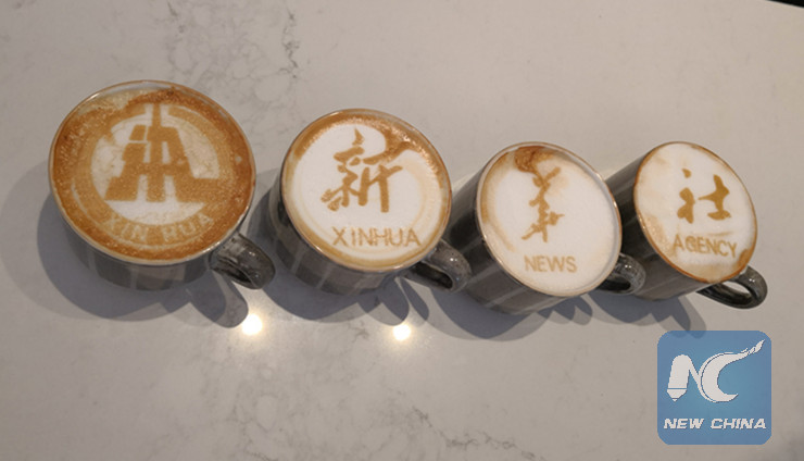 The logo of Xinhua News Agency by 3D printing on the milk foam of cups of coffee. (Xinhua/Du Zhen)