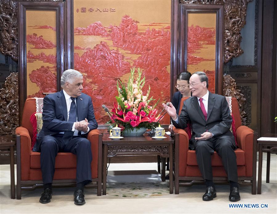 BEIJING, May 1 (Xinhua) -- Chinese Vice President Wang Qishan on Tuesday met with Dominican Foreign Minister Miguel Vargas, who came to Beijing to sign a joint communique on the establishment of diplomatic relations between China and the Dominican Republic.