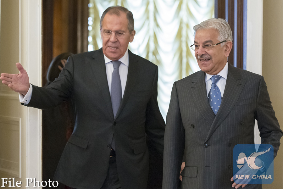 MOSCOW, May 1 (Xinhua) -- Russian Foreign Minister Sergei Lavrov and his Pakistani counterpart Khawaja Muhammad Asif on Tuesday agreed to strengthen bilateral cooperation in counterterrorism, economic, trade and other fields.