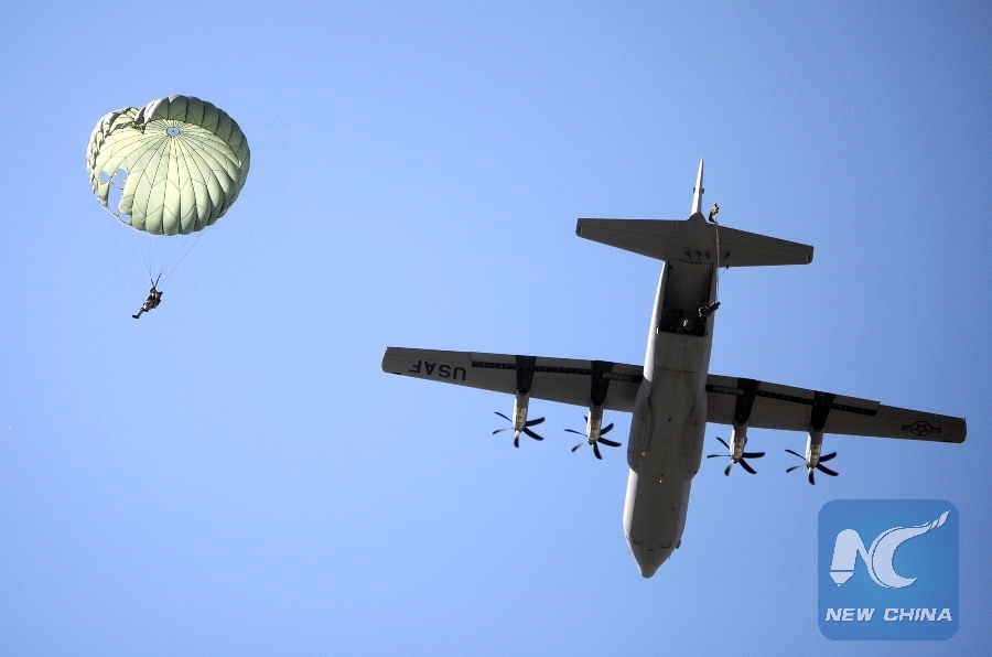 A paratrooper parachutes from a Hercules C-130 airplane during a joint Bulgarian-U.S. military training Thracian Spring 2010 at the Krumovo airbase near the city of Plovdiv, Bulgaria, April 27, 2010. (Xinhua/BTA)