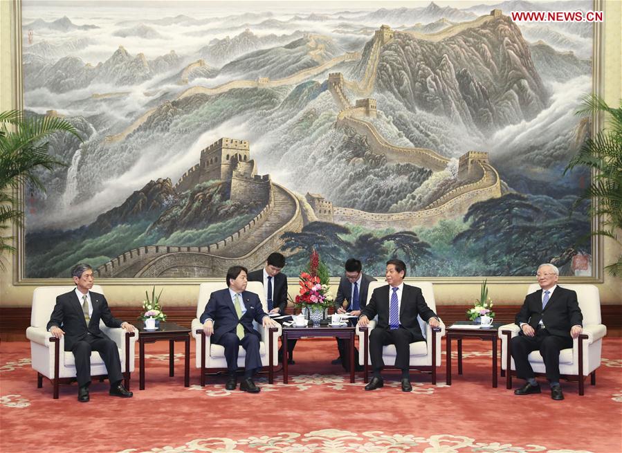 Li Zhanshu (2nd R), chairman of the Standing Committee of the National People's Congress (NPC), meets with the delegation of Japan-China Friendship Parliamentarians' Union led by Hayashi Yoshimasa, in Beijing, capital of China, May 3, 2018. (Xinhua/Pang Xinglei)