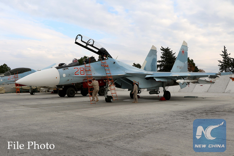 Russian servicemen prepare a Russian Sukhoi Su-30SM fighter jet before a departure for a mission at the Russian Hmeimin military base in Latakia province, in the northwest of Syria, on December 16, 2015. (Xinhua/AFP)