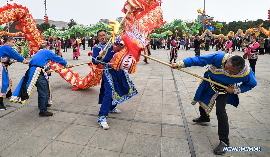 People perform dragon dance at the new Beichuan County, southwest China's Sichuan Province, Feb. 17, 2018. Beichuan was one of the worst-hit areas when a catastrophic earthquake struck Sichuan's Wenchuan County in 2008. Beichuan County later was rebuilt in a new location. On May 12, 2008, an 8.0-magnitude earthquake struck Wenchuan, razing almost the whole county to the ground. After ten years of hard work, Wenchuan has regained life. (Xinhua/Xue Yubin)