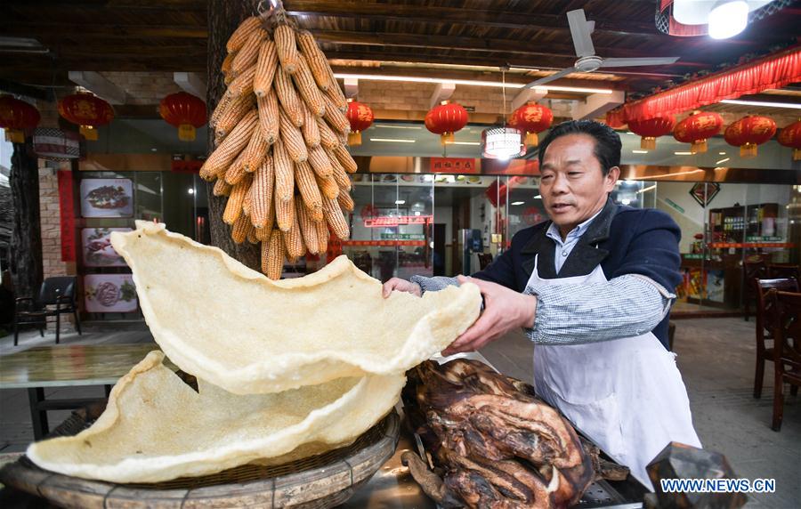 Villager Yang Yungang works at his restaurant at Yingxiu Township of Wenchuan County, southwest China's Sichuan Province, Feb. 12, 2018. On May 12, 2008, an 8.0-magnitude earthquake struck Wenchuan, razing almost the whole county to the ground. After ten years of hard work, Wenchuan has regained life.(Xinhua/Xue Yubin)
