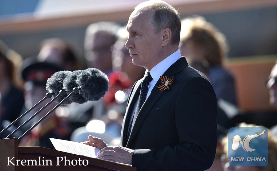 Russian President Vladimir Putin delivers a speech at the military parade in commemoration of the 73rd anniversary of the Victory in the Great Patriotic War of 1941-1945 on the Red Square in Moscow, Russia on May 9, 2018. (KREMLIN PHOTO)