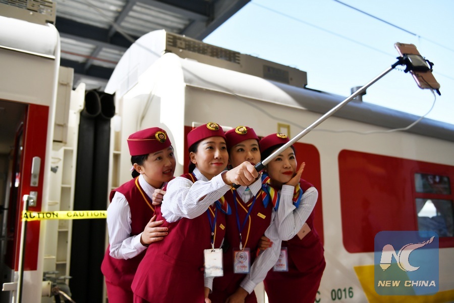 Chinese attendants take a selfie before the start of the first passenger train of the Addis Ababa-Djibouti railway in Addis Ababa, Ethiopia, on Oct. 5, 2016.(Xinhua/Sun Ruibo)