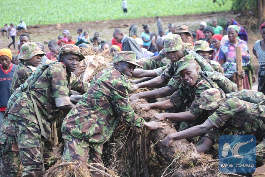Kenyan Defense Forces members take part in the rescue work after a dam collapsed in Nakuru County, Kenya, May 10, 2018. (Xinhua/Allan Mutiso)