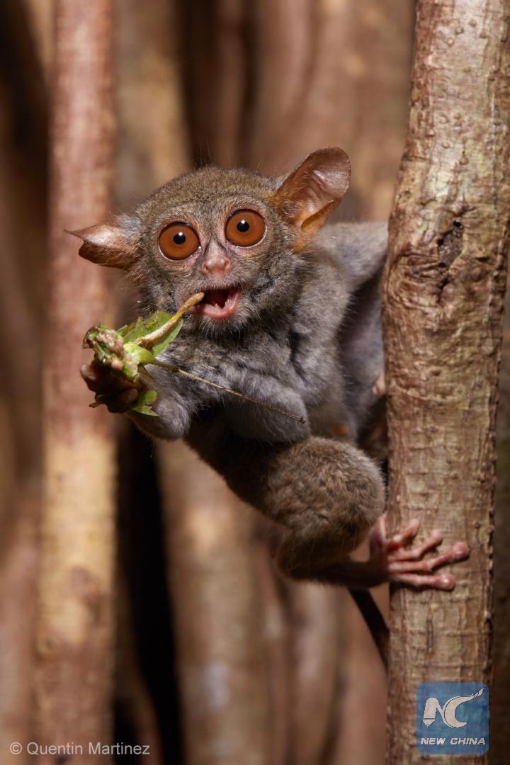 A spectral tarsier (Tarsius tarsier) feeding on a grasshopper in Tangkoko National Park, Northern Sulawesi, Indonesia. Tarsiers have five chitinase genes to digest the high amount of chitin in their insectivorous diet, which likely represents the ancestral condition of all placental animals, including humans. (Credit: Quentin Martinez)