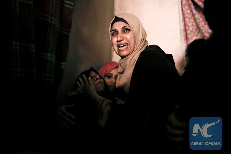 Relatives mourn Palestinian Moein Al-Saai who died of wounds he sustained protesting at the Israeli-Gaza border, during his funeral in Gaza city on May 19, 2018. (AFP)