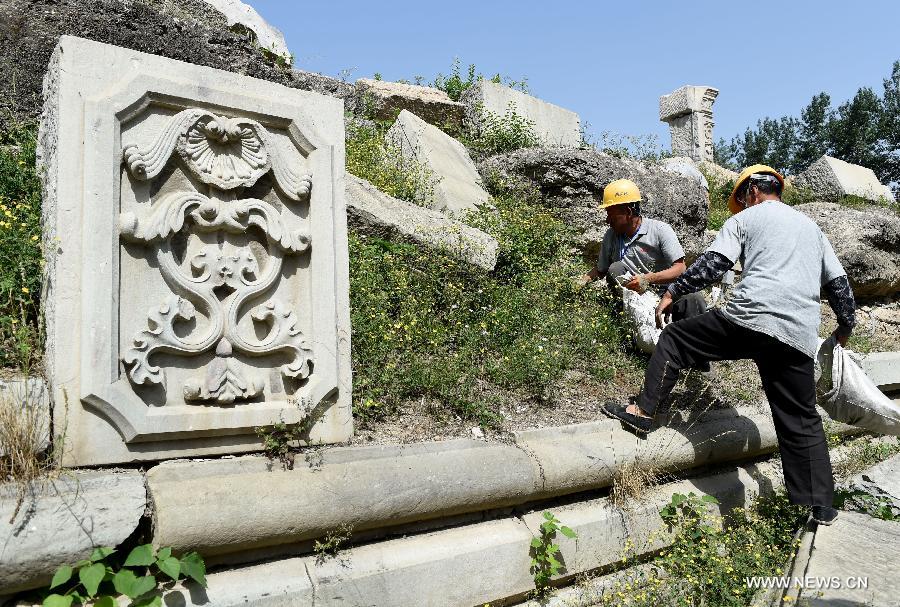 Staff members clean up weeds at ruins of Yuanying Guan (Immense Ocean Observatory) at Yuanmingyuan in Beijing, capital of China, May 23, 2018. The four-month reinforcement project of ruins of Immense Ocean Observatory at the historical site of Yuanmingyuan started lately.(Xinhua/Luo Xiaoguang)