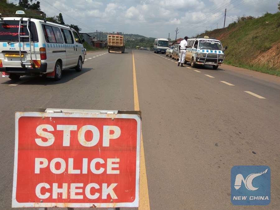 File photo shows a Ugandan police officer inspects a public service vehicle along the Kampala-Masaka Highway, Uganda. (Xinhua/Ronald Ssekandi)
