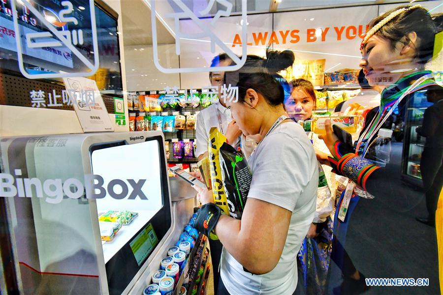 Visitors try out shopping at an unmanned store at the Fifth China Beijing International Fair for Trade in Services in Beijing, May 28, 2018. The fair kicked off here on Monday and will last until June 1. More than 130 seminars, meetings and trade activities have been planned for the fair. (Xinhua/Li Xin)