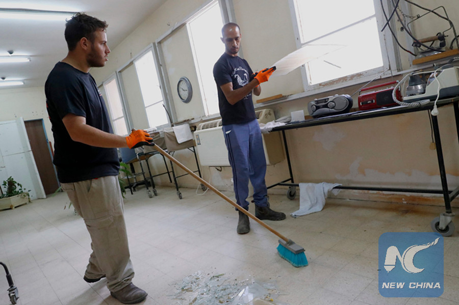 Israeli men clean up the glass from a broken window of a house, after mortar shells fired from the Gaza Strip exploded near it, in the southern Israeli Kibbutz of Ein Hashlosha on May 29, 2018. (AFP PHOTO)