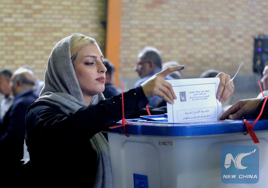 An Iraqi woman living in Iran votes at an overseas polling station for Iraq's parliamentary elections in southern Tehran, Iran, on May 11, 2018. Thousands of Iraqis living in Iran casted their ballots in the country. The 2018 parliamentary election is the first one since Iraq's historical victory over the Islamic State group. (Xinhua/Ahmad Halabisaz)