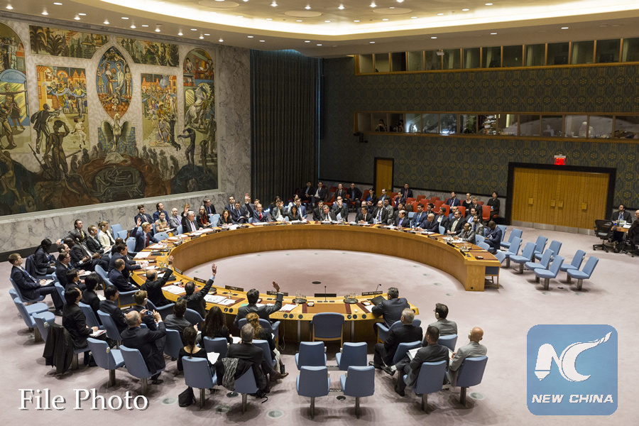Photo taken on Feb. 28, 2017, shows the UN Security Council voting on a draft resolution aiming to establish a sanctions regime over use of chemicals weapons in Syria at the UN headquarters in New York. (Xinhua/Li Muzi)