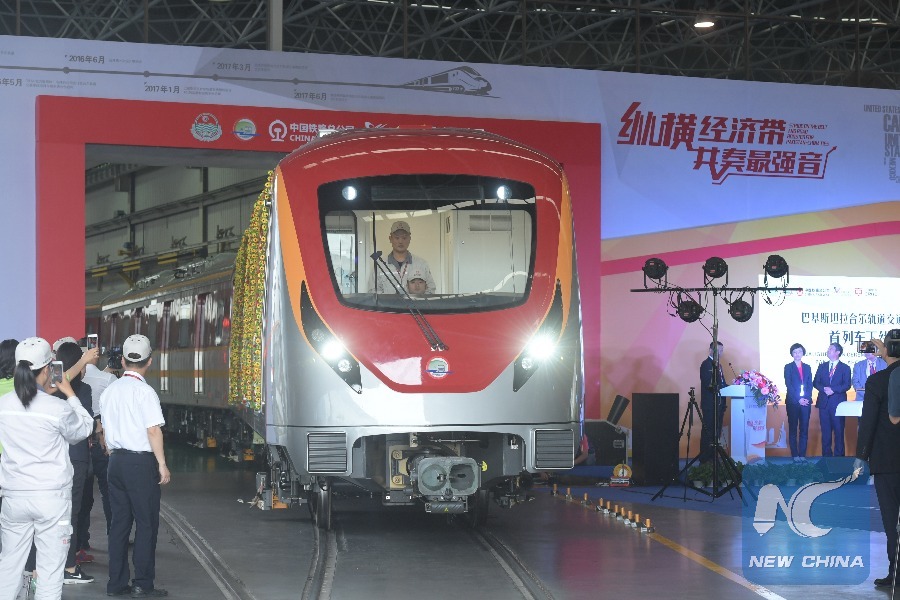 Photo taken on May 15, 2017 shows a new subway train made for Pakistan Lahore Orange Line Project at the CRRC Zhuzhou Locomotive Co., Ltd. in Zhuzhou, central China's Hunan Province. A train designed for a Pakistani subway rolled off the production line in central China's Hunan Province on Monday, the first of 27. The train with five coaches was designed for the 25.58 km Orange Line Metro in Lahore, Pakistan's second largest city. (Xinhua/Long Hongtao)