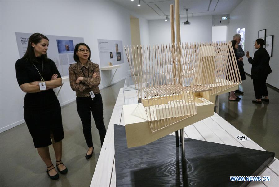 Visitors view a modern cabin's design at the Cabin Fever exhibition media preview at Vancouver Art Gallery in Vancouver, Canada, on June 7, 2018. Called Cabin Fever, the exhibition comprises an entire gallery floor of models, photos, paintings, film and documents covering the role that cabins and cabin life have played in North American culture, lifestyle and architecture. (Xinhua/Liang Sen)