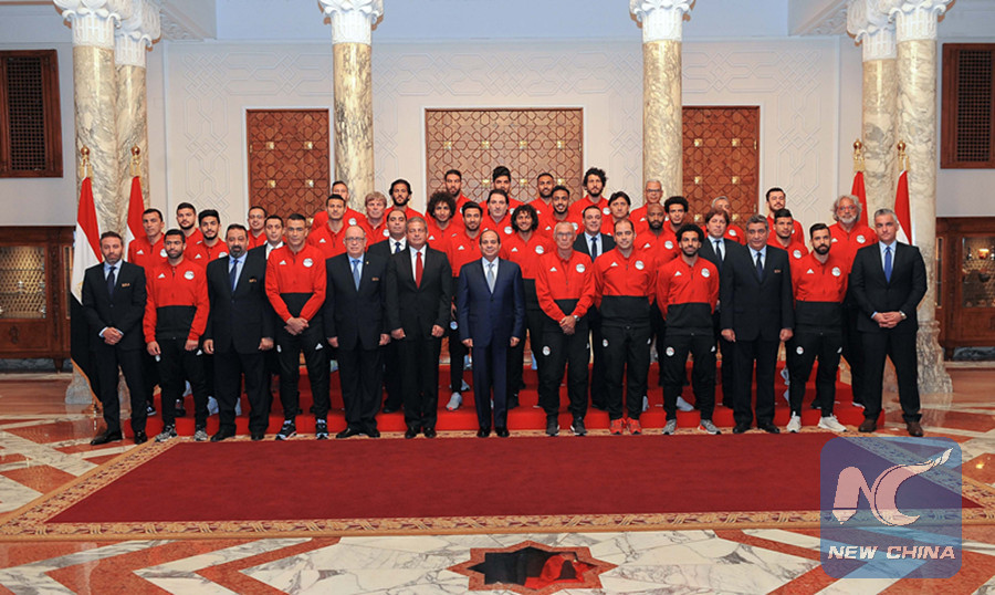 Egyptian President Abdel-Fattah al-Sisi is taken a group photo with Egyptian football players and coaching staff in Cairo, Egypt, on June 9, 2018. (Xinhua/MENA)