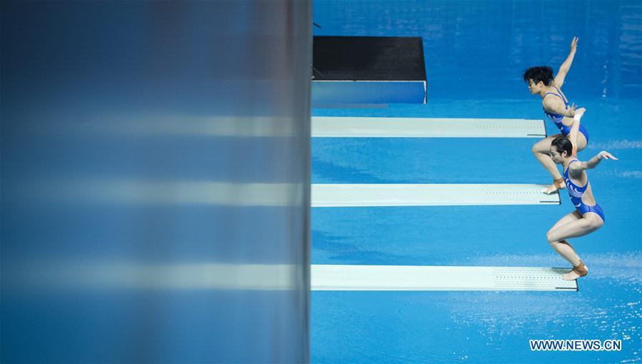 Shi Tingmao(Top) and Chang Yani of China compete during the women's 3m springboard synchronised final at the FINA Diving World Cup 2018 in Wuhan, central China's Hubei Province on June 10, 2018. Shi Tingmao and Chang Yani claimed the title with 334.80 points in total. (Xinhua/Xiao Yijiu)