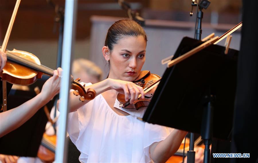A musician of Grant Park Symphony Orchestra performs on the stage at Millennium Park in Chicago, the United States, on June 13, 2018. The Grant Park Music Festival is an annual ten-week classical music concert series held in downtown Chicago.(Xinhua/Wang Ping)