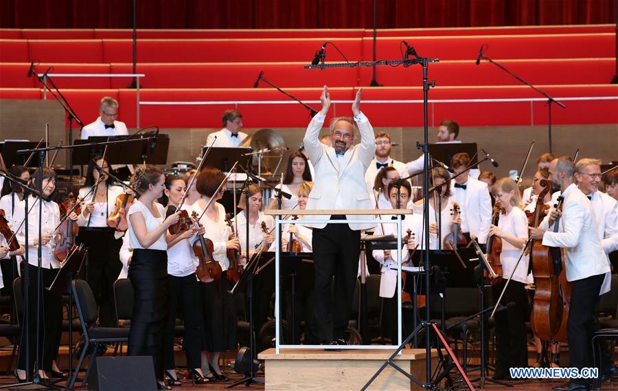 Conductor Carlos Kalmar performs on the stage at Millennium Park in Chicago, the United States, on June 13, 2018. The Grant Park Music Festival is an annual ten-week classical music concert series held in downtown Chicago.(Xinhua/Wang Ping)