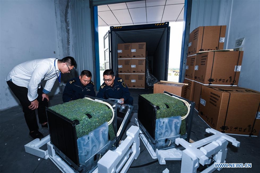Custom officers check imported dish-washing machines shipped by a Yiwu-Madrid freight train at Yiwu west station in Yiwu, east China's Zhejiang Province, Nov. 8, 2017. (Xinhua/Xu Yu)