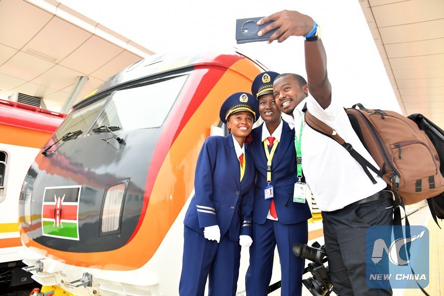 A Kenyan journalist poses for selfies with female train driver Concilia (C) and Alice (L) during the launching day of the Mombasa-Nairobi railway in Mombasa, Kenya, May 31, 2017. Kenyan President Uhuru Kenyatta on Wednesday launched the passenger train service of the 480-km Mombasa-Nairobi Standard Gauge Railway (SGR). (Xinhua/Sun Ruibo)