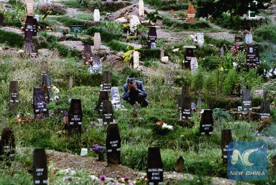 A Bosnian man in a cemetary cries over the grave of his wife in Sarajevo in this Sept. 8, 1993 file photo. The United Nations war crimes tribunal handed down its verdict in 2016 in Bosnian Serb leader Radovan Karadzic's trial for genocide during Bosnia's 1992-95 war. (Xinhua/REUTERS)