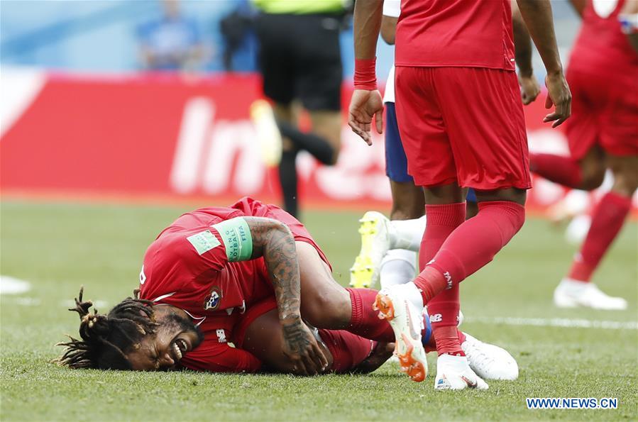 Roman Torres (L) of Panama falls down during the 2018 FIFA World Cup Group G match between England and Panama in Nizhny Novgorod, Russia, June 24, 2018. (Xinhua/Cao Can)