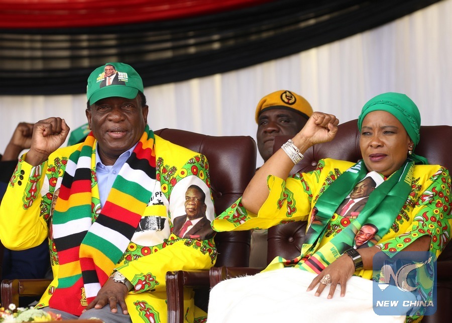 Zimbabwean President Emmerson Mnangagwa (L) and his wife Auxillia Mnangagwa (R) attend a rally of ruling party ZANU-PF in Mutare, Zimbabwe, May 19, 2018. Emmerson Mnangagwa said Saturday that he will proclaim the 2018 election date at the end of May. (Xinhua/Shaun Jusa)