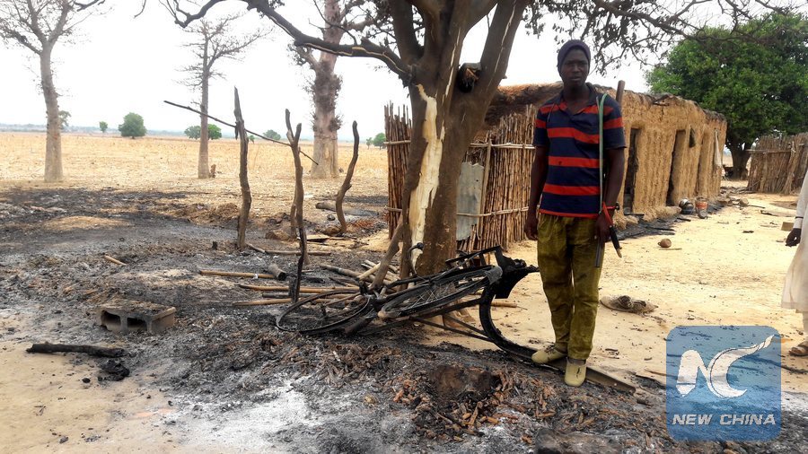 File photo shows a man stand by a burnt bicycle in Gwaska village, Nigeria's northwest state of Kaduna, on May 8, 2018. The death toll of an attack on Gwaska village in Kaduna has risen to 73. (Xinhua/Olatunji Saliu)