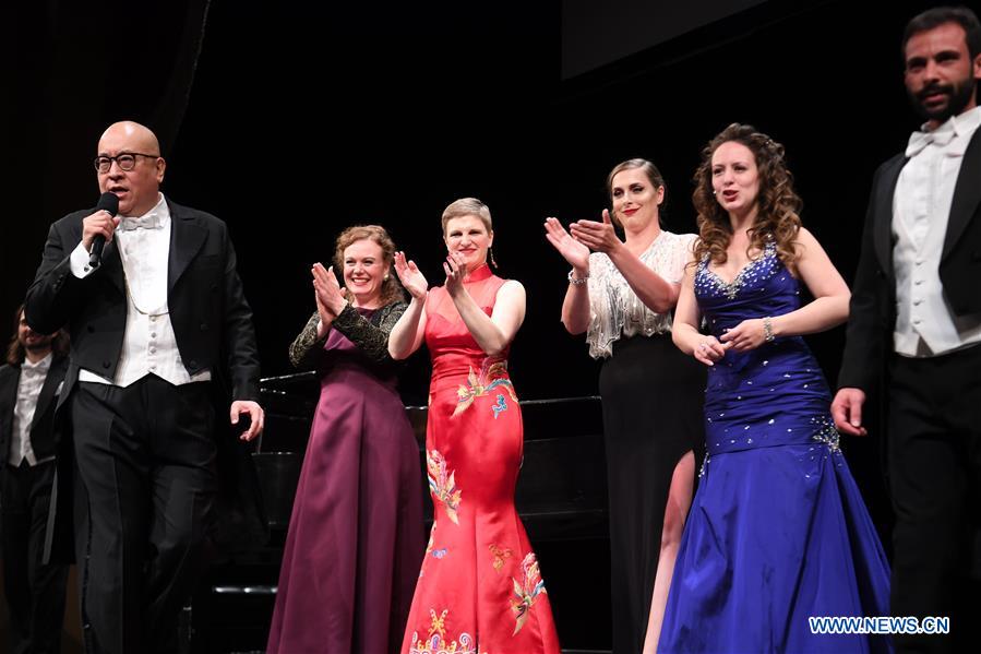 Hao Jiang Tian (1st L), a veteran Chinese American opera bass singer who has played with New York's Metropolitan Opera for over 20 years, responds to a curtain call with other artists at Herbst Theatre in downtown San Francisco, the United States, June 30, 2018. Hao Jiang Tian brought a group of Western tenors and sopranos to San Francisco for the first time on Saturday night to sing some of the most popular Chinese songs in a Western style to nearly 1,000 American and Chinese audience. (Xinhua/Wu Xiaoling)