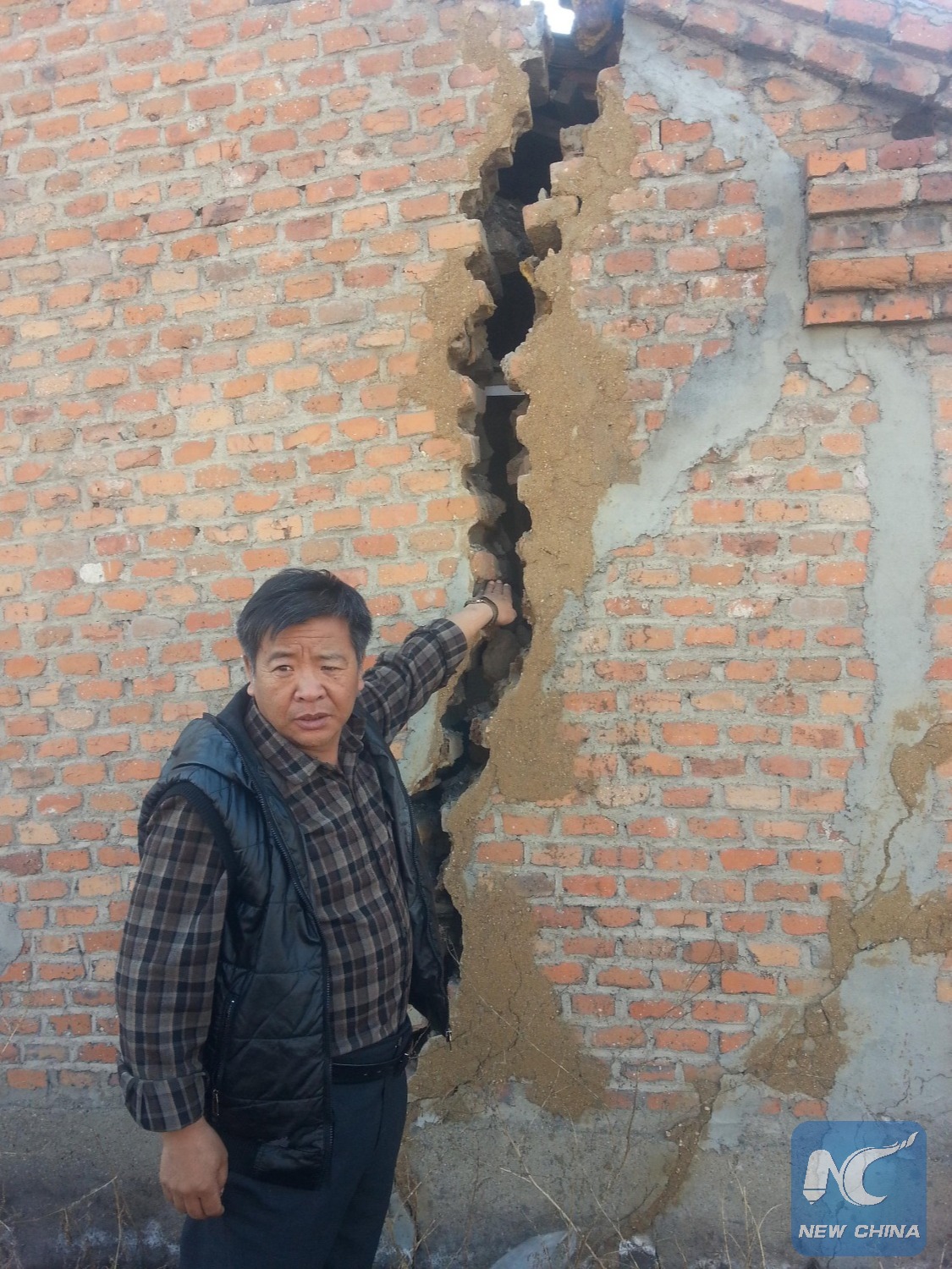 A local resident shows the wide crack stretching from the ground to the roof on the wall of his former home, April 1, 2015. (Xinhua/Qiang Yong)