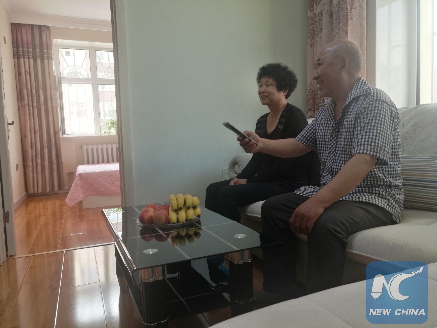 Retired coal miner Li Huancai and his wife Ji Xiuqin in their new home. (Xinhua/Qiang Yong)