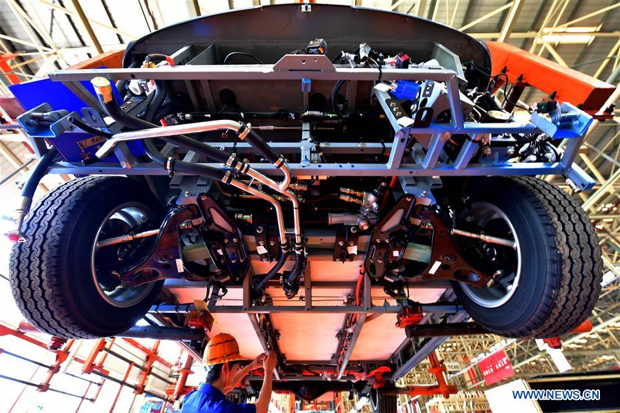 A worker installs an Apolong at its manufacturing facility in Xiamen of southeast China's Fujian Province, July 4, 2018. Chinese tech giant Baidu announced that its newly developed self-driving bus would begin mass production as the 100th bus came off the production line Wednesday in southeast China's Fujian Province. The self-driving bus, named Apolong, was co-developed by Baidu and commercial vehicle manufacturer King Long. The bus, which lacks a steering wheel, driver's seat and brake, is instead equipped with a Baidu Apollo autonomous driving system, which is able to perceive its surroundings, predict the movements of vehicles and pedestrians, and plan optimized routes based on high-definition maps and intelligent sensing capability, according to Chen Weixiang, vice CTO of King Long. (Xinhua/Wei Peiquan)