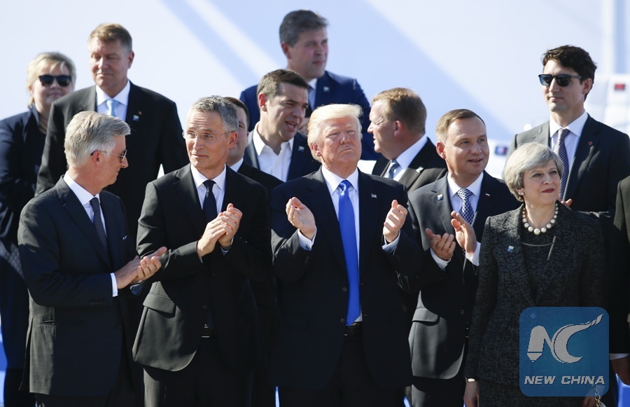 File Photo: King Philippe of Belgium, NATO Secretary General Jens Stoltenberg, U.S. President Donald Trump, British Prime Minister Theresa May (from L to R, front) and other NATO member states leaders watch air show at the handover ceremony of the new NATO headquarters during a one-day NATO Summit, in Brussels, Belgium, May 25, 2017. (Xinhua/Ye Pingfan)