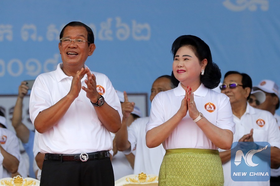 Cambodian Prime Minister Samdech Techo Hun Sen (L), president of the ruling Cambodian People's Party (CPP), and his wife Bun Rany attend an election campaign in Phnom Penh, Cambodia, on July 7, 2018. (Xinhua/Phearum)