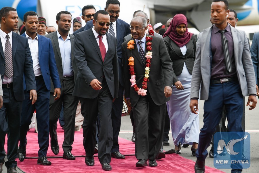 File photo shows Ethiopian Prime Minister Abiy Ahmed (C) welcomes Eritrean Foreign Minister Osman Salah (2nd R, front) at Bole International Airport in Addis Ababa, capital of Ethiopia, June 26, 2018. (Xinhua/Michael Tewelde)