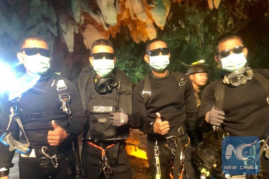Photo released by Royal Thai Navy on July 10, 2018 shows the last four Thai Navy SEAL divers coming out safely after completing the rescue mission inside the Tham Luang cave, in Chiang Rai, Thailand. (Xinhua/Thai Navy SEAL)