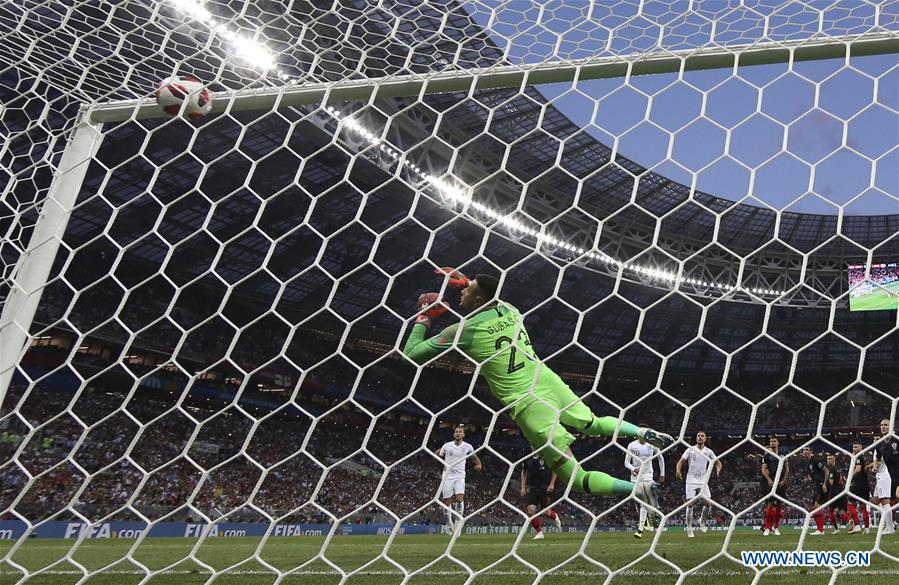 Goalkeeper Danijel Subasic of Croatia fails to save the ball during the 2018 FIFA World Cup semi-final match between England and Croatia in Moscow, Russia, July 11, 2018. Croatia won 2-1 and advanced to the final. (Xinhua/Cao Can)