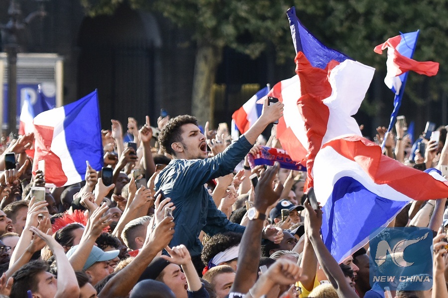 Fans cheer the French team in Paris, France on July 10, 2018. Parisians gathered on Tuesday evening at the Hotel de Ville of Paris to support the French team who defeated the Belgian team by 1-0 during the semi-final of 2018 Russian World Cup. (Xinhua/Chen Yichen)