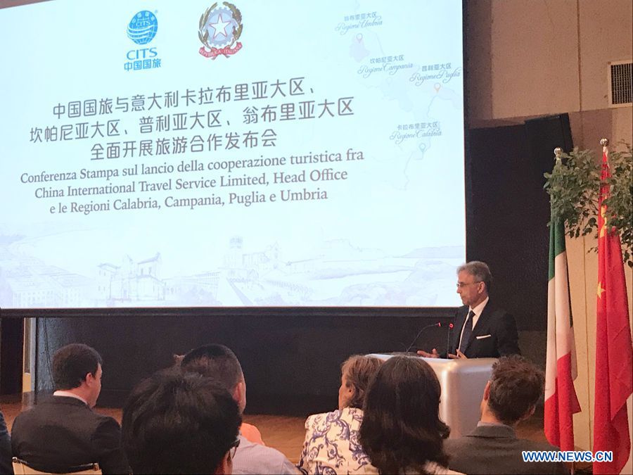 Italian Ambassador to China Ettore Francesco Sequi speaks during a press conference on the launch of tourism cooperation between China International Travel Service Limited, Head Office (CITS) and four regions of Italy held in Beijing, capital of China, July 16, 2018. (Xinhuanet/Zhou Xin)