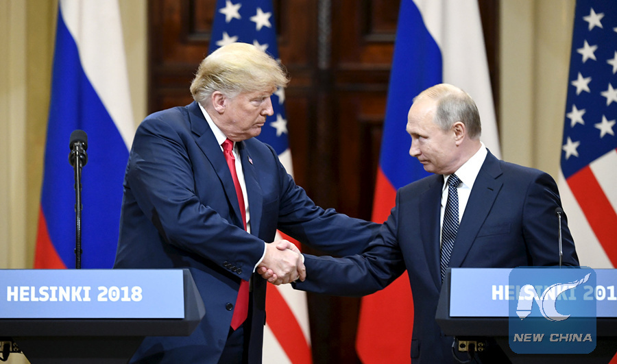 U.S. President Donald Trump (L) shakes hands with Russian President Vladimir Putin during a joint press conference in Helsinki, Finland, on July 16, 2018. (Xinhua/Lehtikuva/Jussi Nukari)