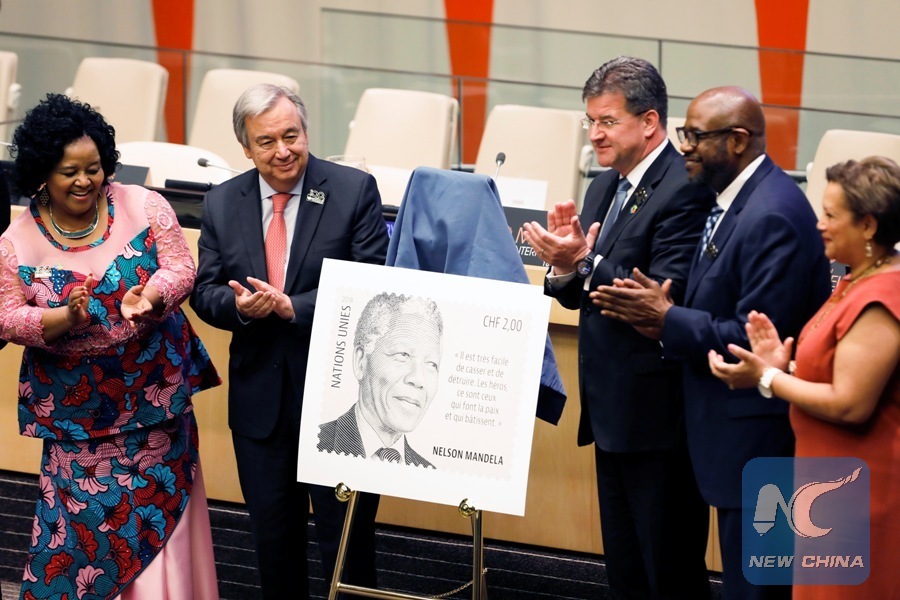 A new postal stamp of Nelson Medela is unveiled during the Informal Meeting of the UN General Assembly on the occasion of the Annual Observance of the Nelson Mandela International Day, at the UN headquarters in New York, July 18, 2018. (Xinhua/Li Muzi)